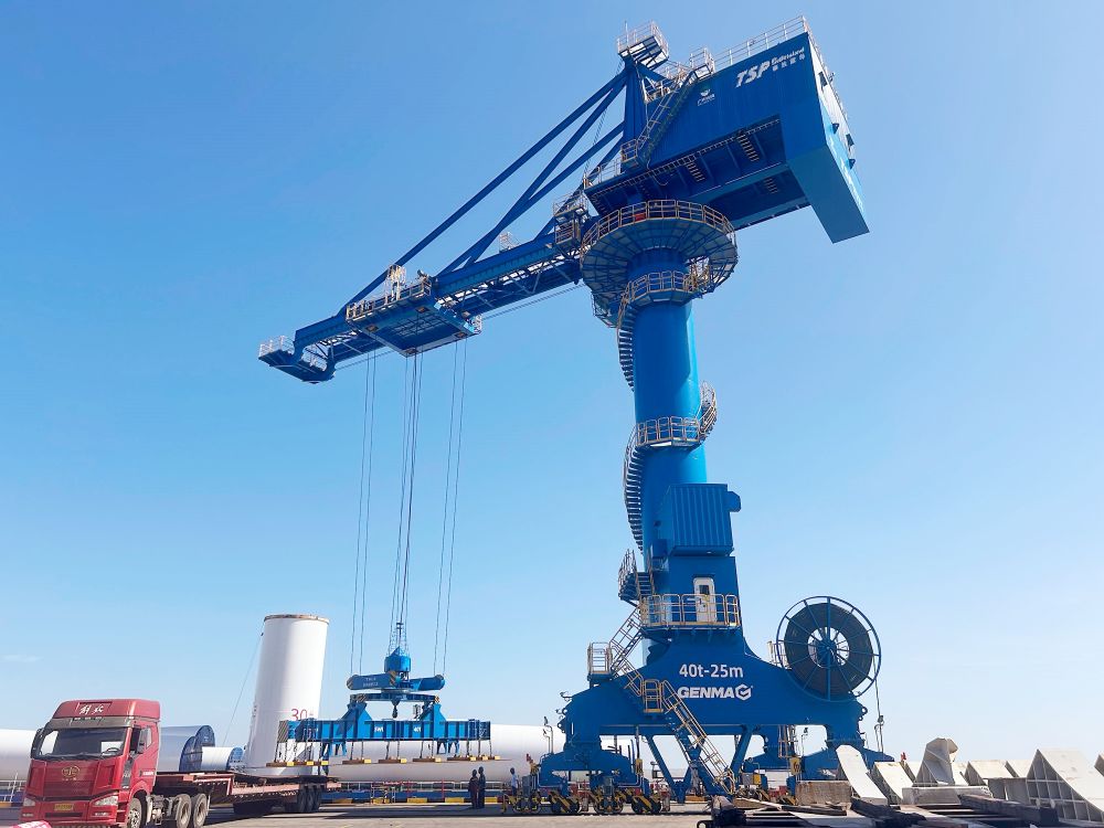 該設備在傳統門座式起重機基礎上進行了多項創新設計,兼具電磁吊與吊鉤雙功能,電磁吊模式下設備起重量達40噸,吊鉤模式下可達55噸,可靈活應對鋼板及件雜貨的卸船作業需求。