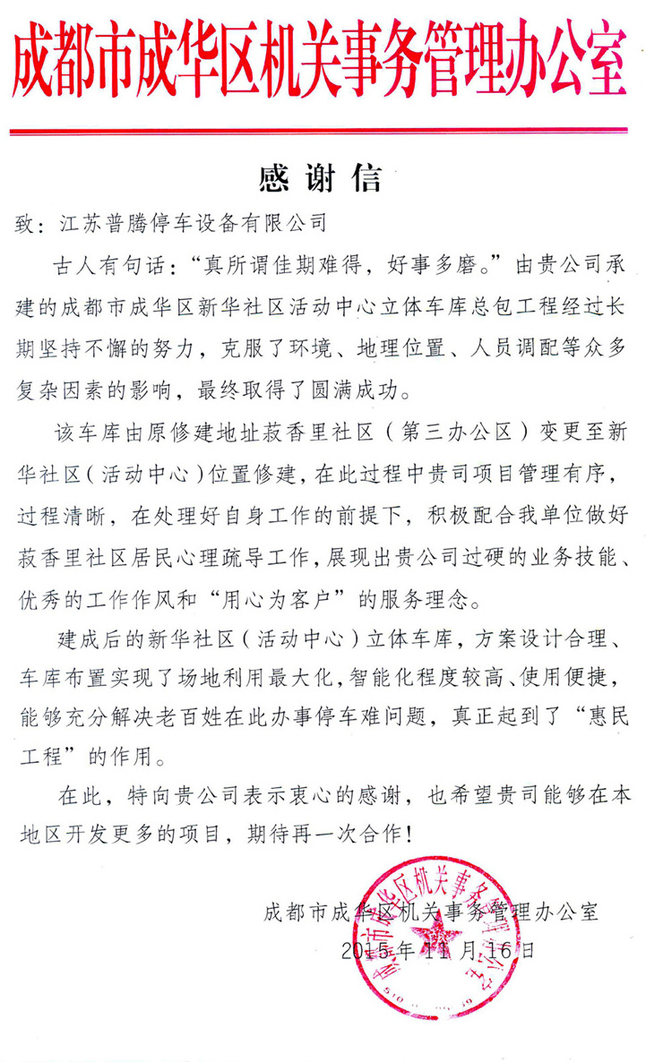 近日,江蘇普騰獲成都新華區(qū)機(jī)關(guān)事務(wù)管理辦公室發(fā)來的感謝信。感謝江蘇普騰在“成都新華社區(qū)立體車庫(kù)項(xiàng)目”建設(shè)過程中展現(xiàn)出的良好工作作風(fēng)及“用心為客戶”的服務(wù)理念。同時(shí)對(duì)該項(xiàng)目設(shè)計(jì)的合理性、便捷性給予了肯定。