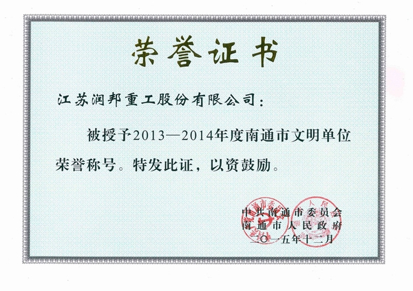日前,潤邦股份獲得了由中共南通市委、南通市人民政府授予的“2013-2014年度南通市文明單位”稱號。