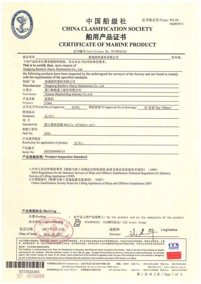 日前,由公司與荷蘭GustoMSC聯合打造的1000噸繞樁式海洋起重機順利取得了由中國船級社(CCS)頒發的船用產品證書,標志著公司在千噸級海洋起重機領域邁出了堅實的一步。