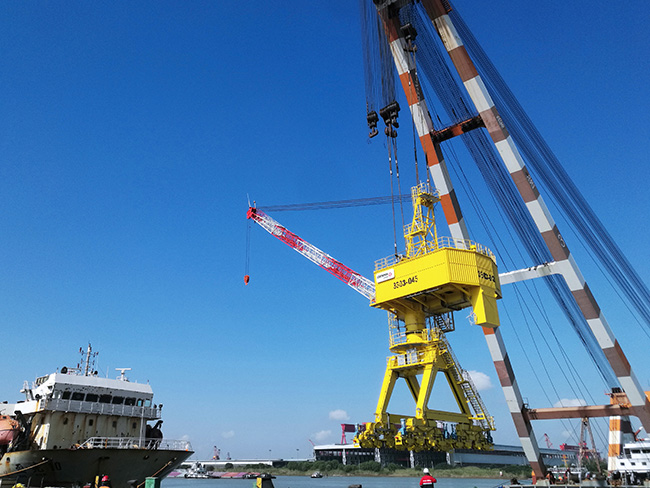 該產品安裝于70000t浮式船塢上,整機重約295噸,最大工作輪壓40000lbs,整機按照ABS起重設備規范及其它國際相關標準設計、制造和測試驗收??紤]到當地多臺風的氣候條件,此臺產品可抵擋最高18級超強臺風,完全滿足了高風速環境下的作業要求。