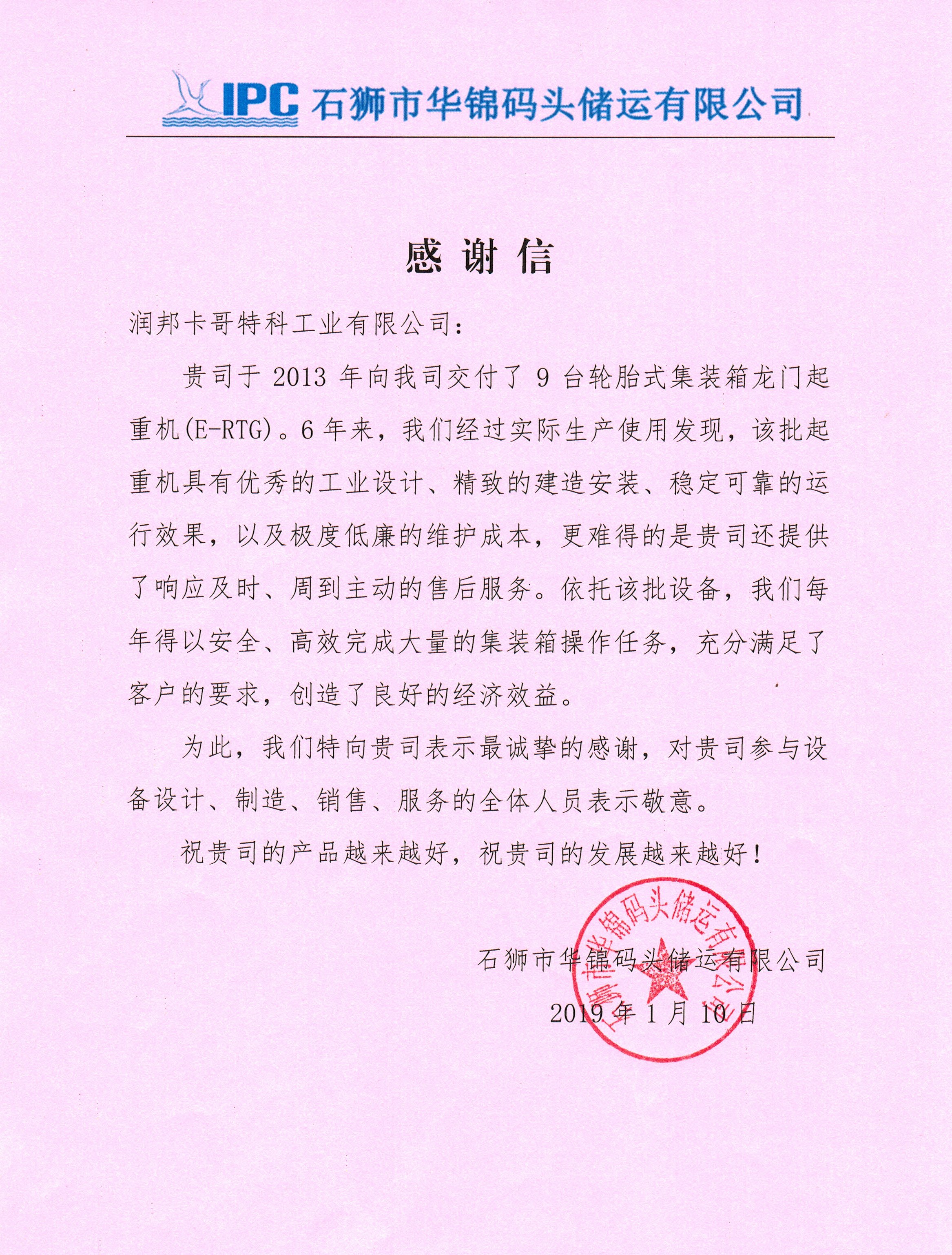 近日,潤邦卡哥特科收到石獅市華錦碼頭儲運有限公司發來的感謝信。信中對潤邦卡哥特科承建的9臺輪胎式龍門起重機的設計、性能、運行效果表示大力認可及高度贊揚。信中提到,6年來,經過實際生產使用發現,我司制造的起重機具有優秀的工業設計、精致的建造安裝、穩定可靠的運行效果、極其低廉的維護成本,以及響應及時、周到主動的售后服務。依托該批設備,為其完成了大量的集裝箱操作業務,創造了良好的經濟效益。
