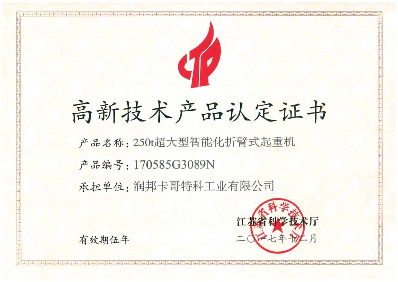 近日,由子公司潤邦卡哥特科研發的“250t超大型智能化折臂式起重機”項目再獲江蘇省科學技術廳高新技術產品認定證書。此項高新技術產品證書的獲得,是對潤邦卡哥特科科研創新能力的充分認可。潤邦卡哥特科將進一步提高自主創新能力,推進...
