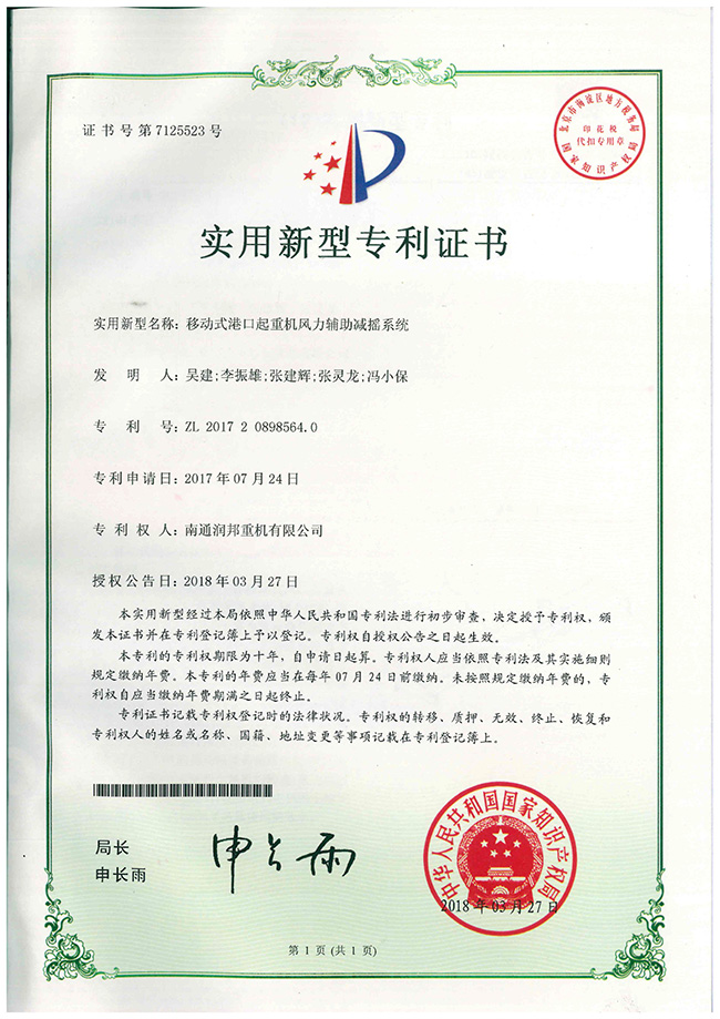 近期,潤邦重機獲得了由國家知識產權局授權的兩項實用新型專利證書,分別為“移動式港口起重機風力輔助減搖系統”和“一種氣力卸船機”,標志著公司在港口機械領域取得了新的技術突破。
