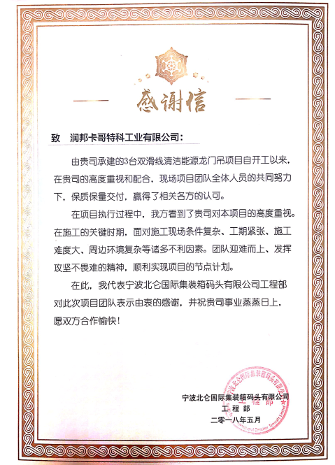 近日,潤邦卡哥特科收到寧波北侖國際集裝箱碼頭有限公司發來的感謝信,對公司承建的3臺雙滑線清潔能源龍門吊項目團隊在面對施工現場條件復雜,工期緊張等諸多不利因素的情況下,迎難而上,保質保量完成項目節點計劃給予了充分的認可和高度...