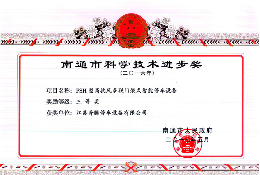 近日,子公司江蘇普騰又一項產品“PSH型高抗風多聯門架式智能停車設備”獲得由南通市人民政府頒布的2016年度“南通市科學技術進步獎”三等獎。該項殊榮的再次獲得,進一步肯定了公司在產品技術創新方面的工作,今后公司也將繼續加大新產品...